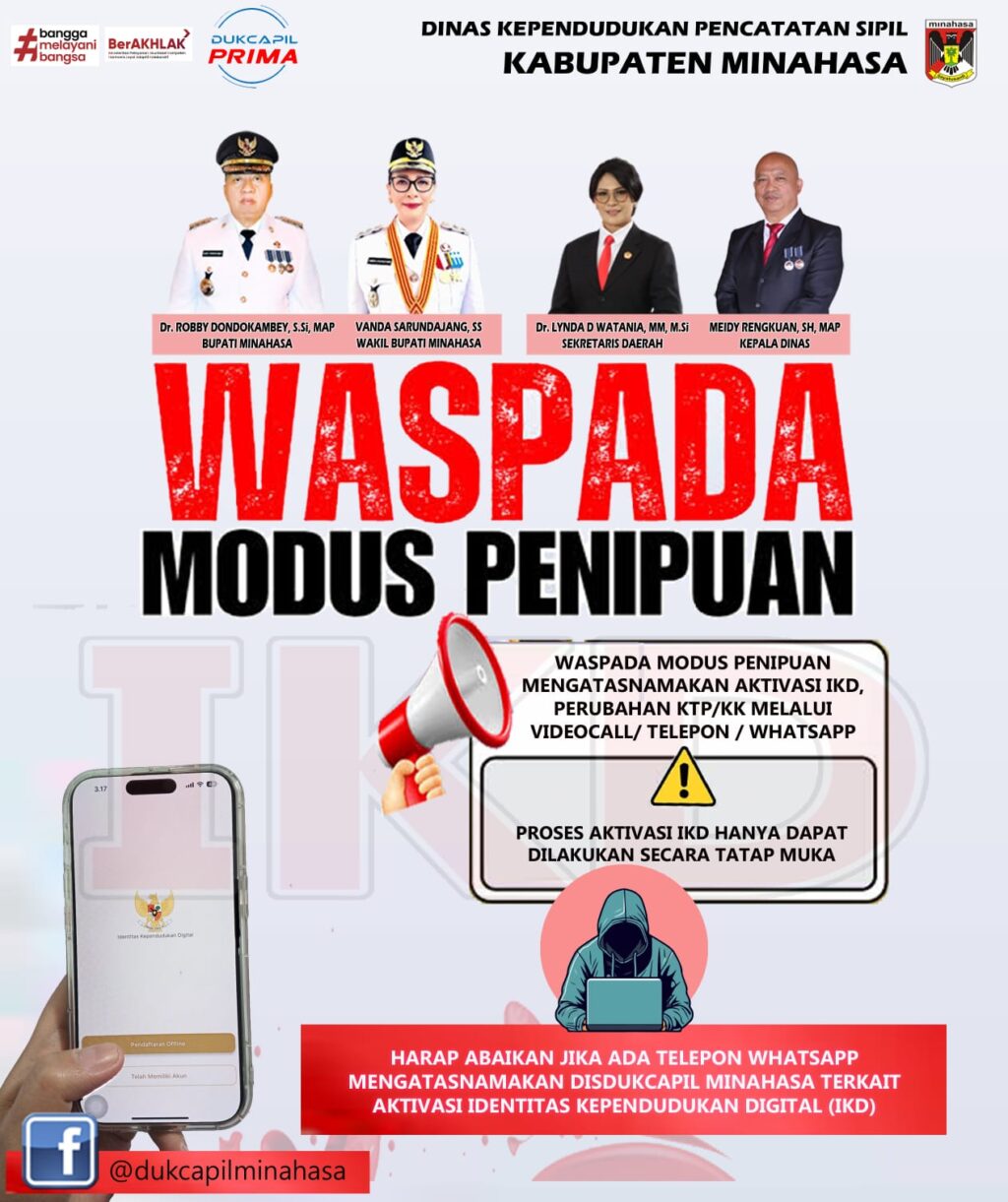 Oborsulut.com,Tondano – Pemerintah Kabupaten Minahasa dibawah kepemimpinan Bupati Robby Dondokambey dan Wakil Bupati Vanda Sarundajang bersama Sekretaris Daerah Lynda Watania mengimbau kepada warga Minahasa yang akan mengaktifkan identitas kependudukan digital (IKD) untuk mendatangi kantor Dinas Kependudukan dan Pencatatan Sipil (Dukcapil) Minahasa di Tondano, agar terhindar dari penipuan.